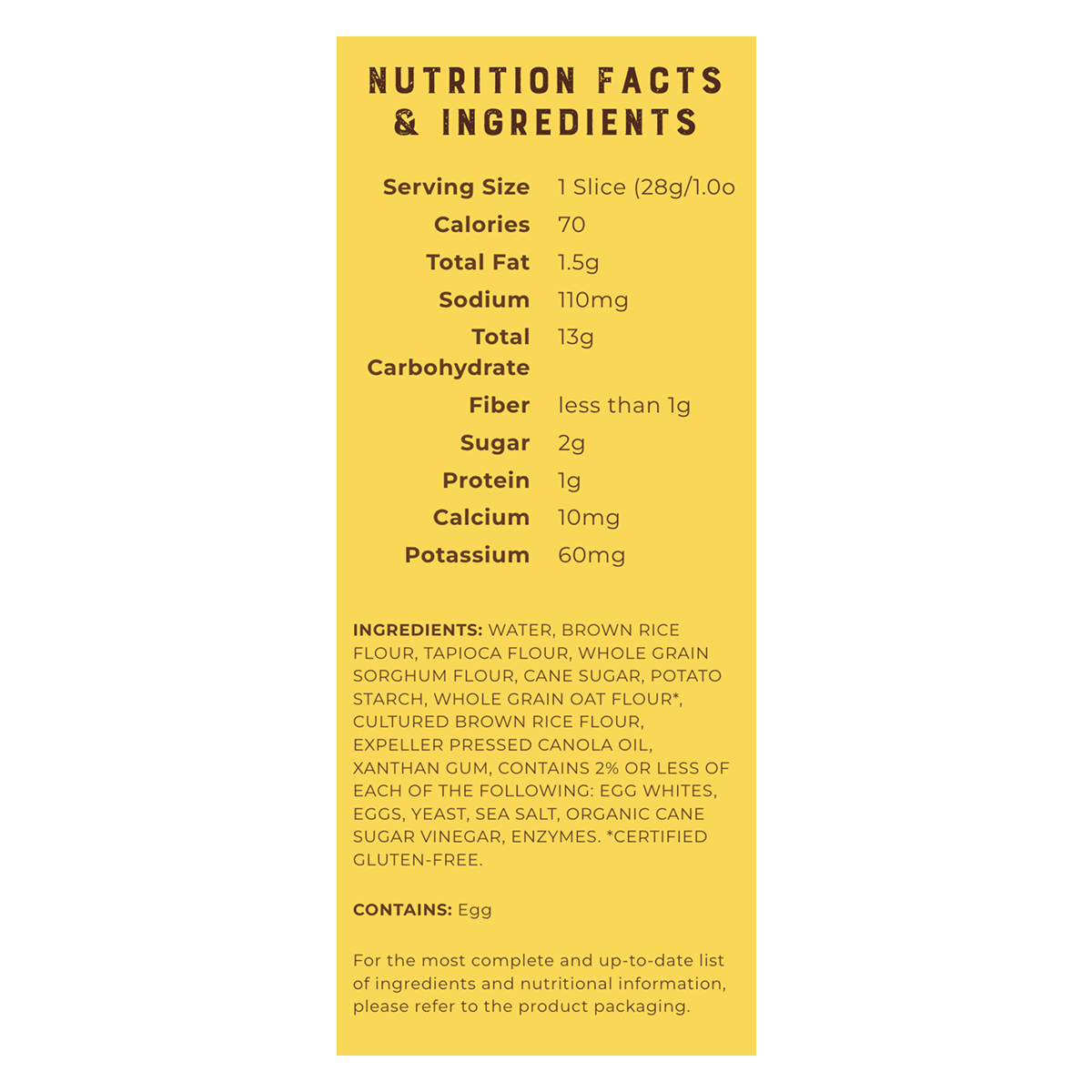 Certificado sin gluten, el pan Country White también está libre de lácteos, nueces y soya, y está elaborado con granos integrales.